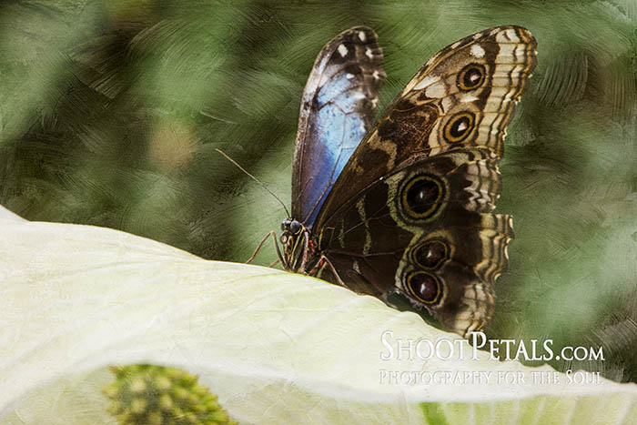 Large Tree Nymph butterfly at Victoria Butterfly Gardens. Cropping out the damaged wings and adding several textures to create a 'painterly' picture.The goal in butterfly photography is to get both the butterfly and the flower (or the part that the butterfly is on) in focus and the background out of focus. Whatever is sharp attracts attention... and you want your viewers' eyes to rest on the subject!